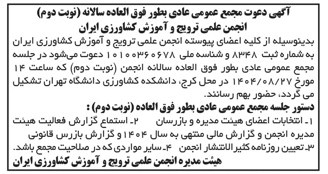 احتراما، به استحضار می رساند، مجمع عمومی و انتخابات سیزدهمین دوره هیات مدیره و بازرس انجمن، درتاریخ ۱۴۰۴/۰۸/۲۷ ماه در دانشکده کشاورزی دانشگاه تهران برگزار خواهد شد.